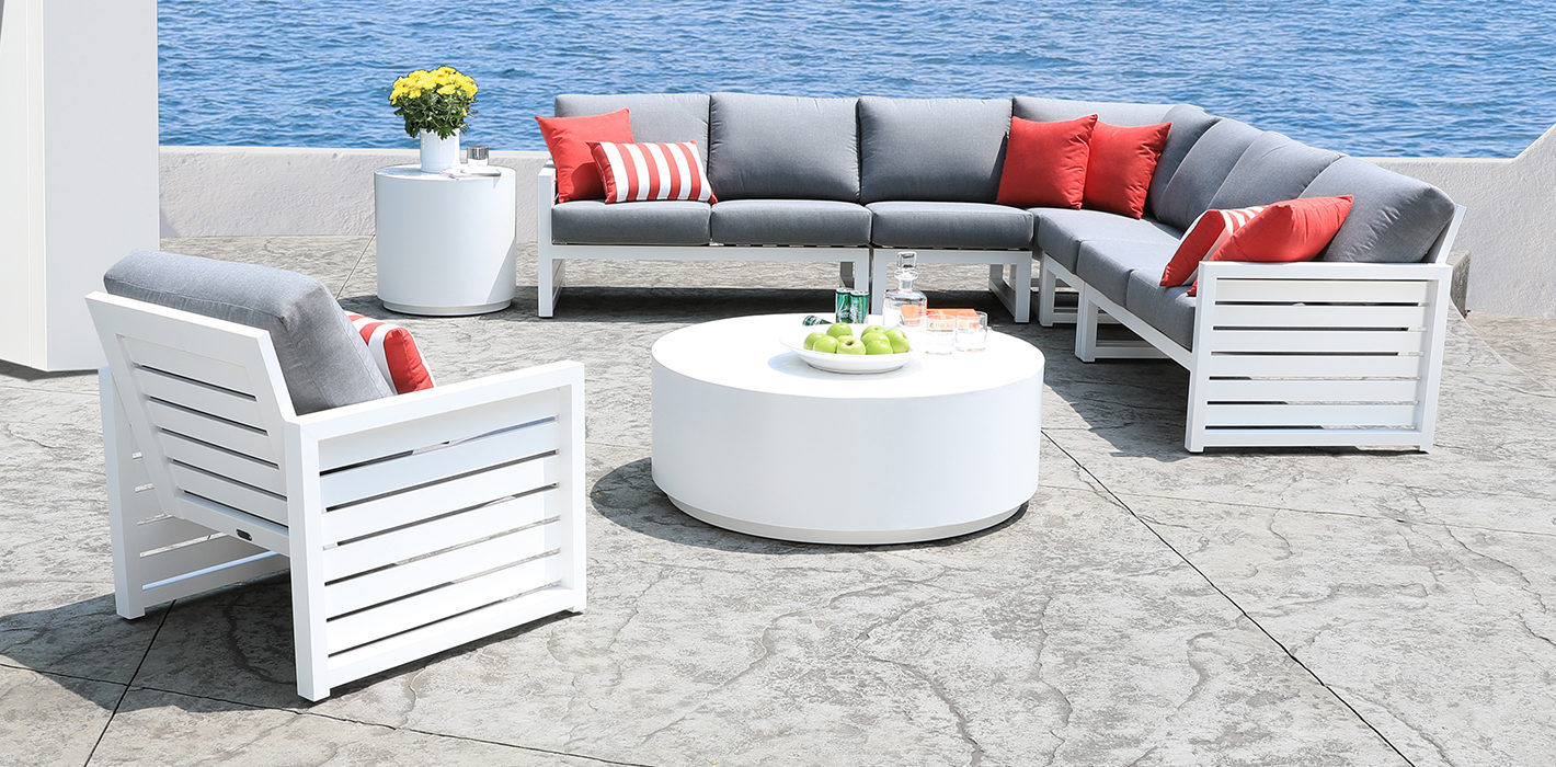 The Gramercy Sectional collection sports a modern/transitional-style nautical look. The pieces are built with highly durable heavyweight frame for added stability in windy areas; and feature a choice of cushions made of premium, fade-resistant outdoor Sunbrella® fabrics.