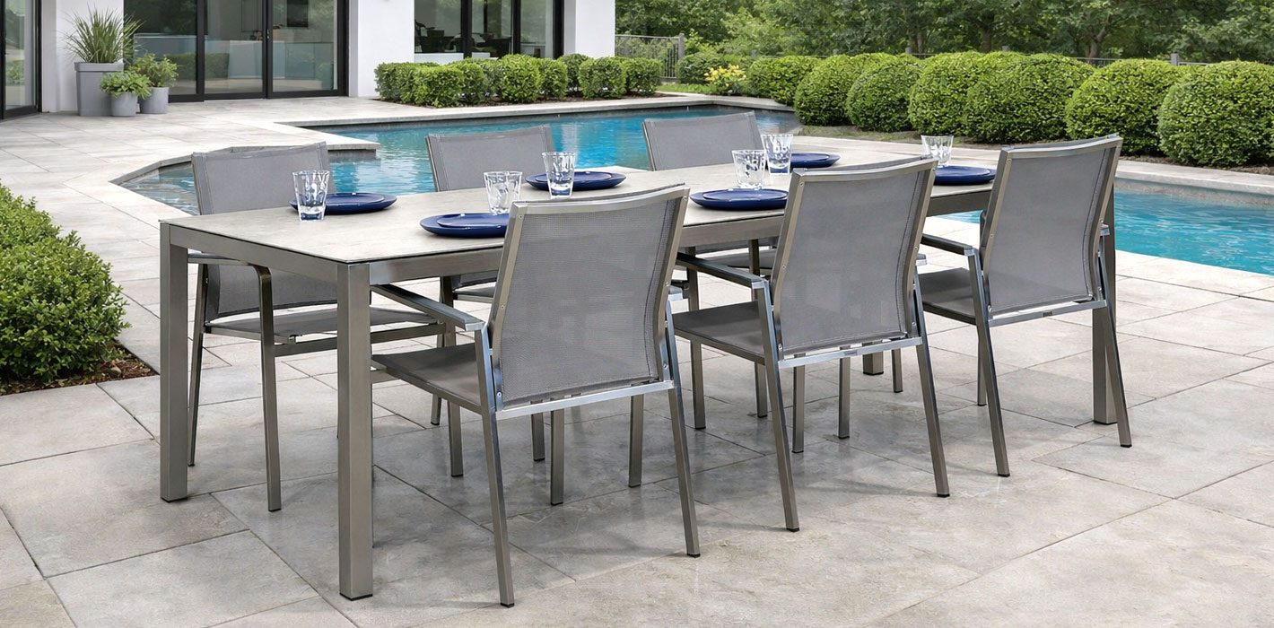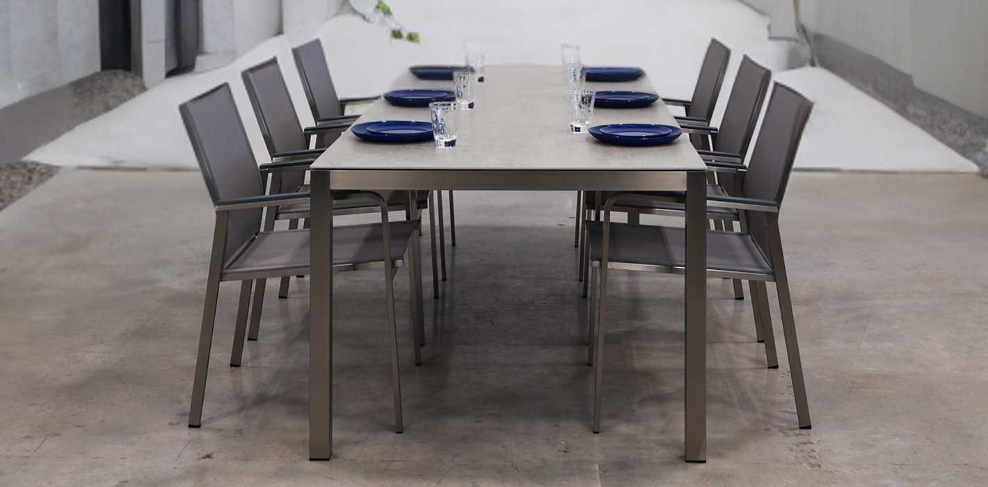 Lisbon SS Collection features weather-resistant stainless steel frame with Spanish ceramic tops. Armchairs are coordinating in two styles: Union and Fermo.