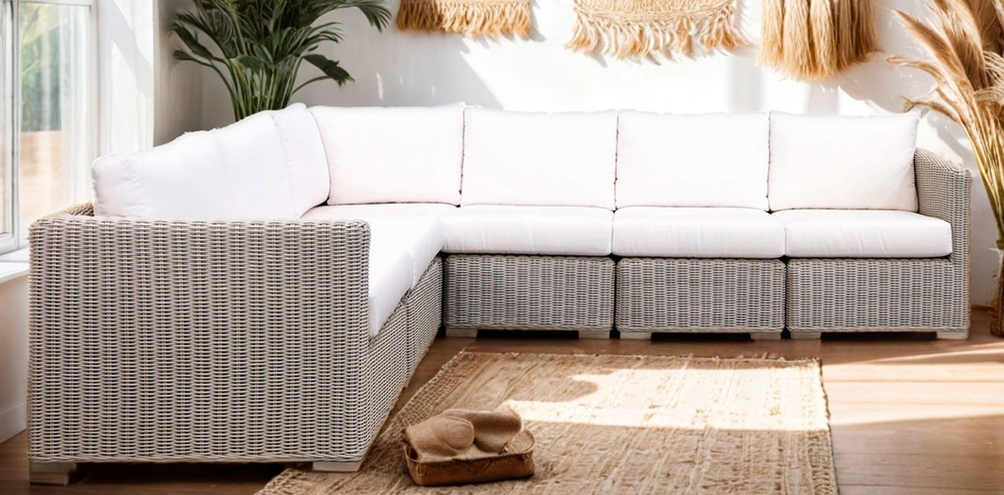 Designed for small to mid size outdoor spaces, our most comfortable compact collections, choose your combination of modules to create the perfect size sectional for your space, features 5mm round wicker for a sophisticated look, durable aluminum frame, weather resistant, Premium Canadian-made cushion featuring Sunbrella Brand custom-choice fabric.