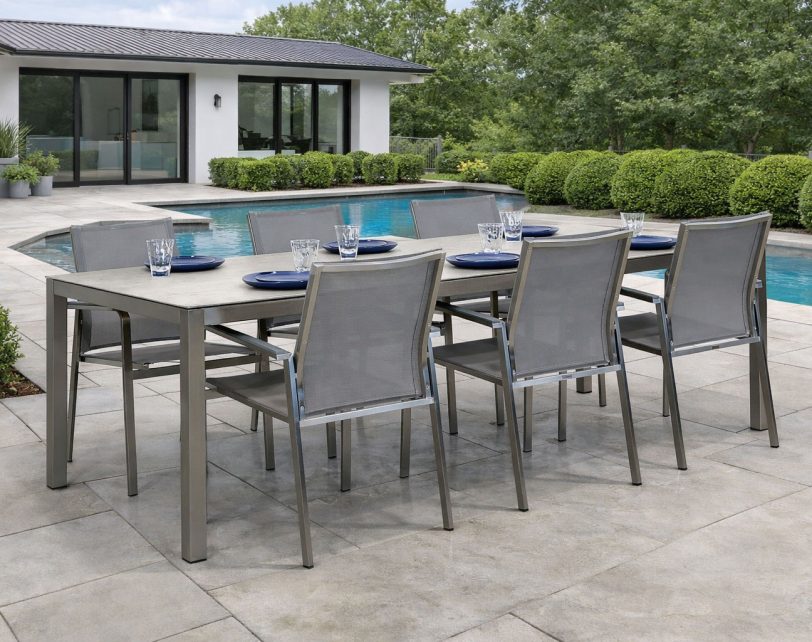 Lisbon Dining Set – Stainless Steel Item # Lisbon Dining Set Stainless Steel Table Frame Spanish Ceramic Table Top Stainless Steel Armchair with Grey Sling Fabric